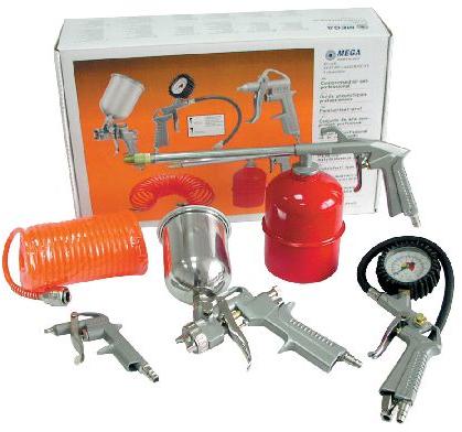 A készlet tartalma: manométeres fúvópisztoly, mosópisztoly, felsõ tartállyal ellátott festékszóró pisztoly, 5 m-es spirál légtömlõ Összekötõk 1/4