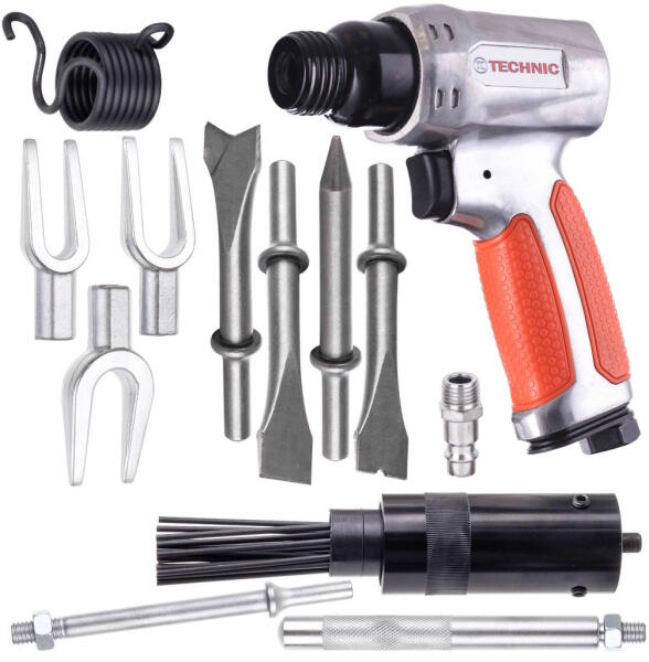Pneumatikus tűs-véső kalapács, sűrített levegős, tűs és véső betétekkel, csapszegekhez, kormányösszekötőkhöz és gömbcsuklók szétválasztásához Pneumatikus tűs-véső kalapács professzionális felhasználásra, különösen csapszegek, kormányösszekötő rudak és gömbcsuklók gyors és hatékony szétválasztásához, kiütéséhez. Ideális autószervizek, gépjárműjavító műhelyek és ipari karbantartók számára, ahol elengedhetetlen a precíz, nagy ütőerejű és megbízható szerszám. A pneumatikus működtetésnek köszönhetően a szerszám kisebb fizikai terhelés mellett biztosít nagy teljesítményt, és jelentősen felgyorsítja a javítási, szerelési munkafolyamatokat. A tűs és véső kialakítás sokoldalú felhasználást tesz lehetővé a futómű, felfüggesztés és csuklók területén. Főbb jellemzők